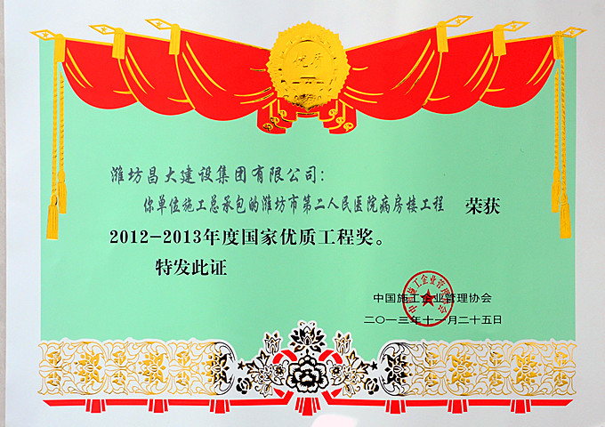 2013年12月27日,中國施工企業(yè)管理協(xié)會在北京召開“2012-2013年度國家優(yōu)質(zhì)工程獎”表彰大會,為獲獎?wù)哳C獎。由集團第一分公司施工的濰坊市第二人民醫(yī)院病房樓工程獲此殊榮。 國家優(yōu)質(zhì)工程獎是我國工程建設(shè)質(zhì)量方面跨行業(yè)、跨專業(yè)的國家級榮譽獎勵,已經(jīng)成為政府提倡、社會知名、企業(yè)向往、專家認可、實踐過硬的著名品牌,以其權(quán)威性、規(guī)范性、指導(dǎo)性、示范性在工程建設(shè)領(lǐng)域享有崇高的聲譽。