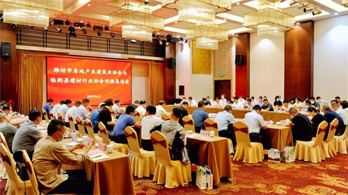 2022年6月11日,濰坊市房地產(chǎn)業(yè)協(xié)會(huì)、濰坊市建筑業(yè)協(xié)會(huì)與臨朐縣建材行業(yè)協(xié)會(huì)對(duì)接懇談會(huì)在臨朐縣攬翠湖酒店舉行。濰坊市建筑業(yè)發(fā)展服務(wù)中心副主任丁士剛,濰坊市房地產(chǎn)業(yè)協(xié)會(huì)會(huì)長、集團(tuán)董事長徐鵬強(qiáng),濰坊市建筑業(yè)協(xié)會(huì)會(huì)長、集團(tuán)總工程師房海,臨朐縣委副書記、縣長陳誠,縣委常委、辦公室主任王磊,副縣長董樹華,市房協(xié)副會(huì)長單位和市建協(xié)副會(huì)長單位20余位負(fù)責(zé)人,臨朐縣相關(guān)部門負(fù)責(zé)人出席對(duì)接懇談會(huì)。