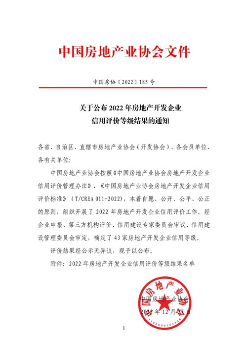 2022年12月27日,中國房地產(chǎn)業(yè)協(xié)會(huì)公布了2022年全國房地產(chǎn)開發(fā)企業(yè)信用評價(jià)等級(jí)結(jié)果,全國43家房地產(chǎn)開發(fā)企業(yè)經(jīng)嚴(yán)格、公正評審后獲評信用等級(jí)。集團(tuán)泰和置業(yè)榮獲此次信用評價(jià)的最高等級(jí)——AAA級(jí),這也是泰和置業(yè)繼2016年、2019年獲評AAA級(jí)后,再次獲得國家權(quán)威機(jī)構(gòu)的肯定。作為衡量一家企業(yè)綜合實(shí)力的重要指標(biāo),企業(yè)AAA信用評級(jí)具有極高“含金量”。依據(jù)對評估對象的信用紀(jì)錄、履約能力、經(jīng)營狀況以及專家實(shí)地核驗(yàn)等多項(xiàng)指標(biāo)的科學(xué)評估與認(rèn)證,企業(yè)信用等級(jí)越高,代表其經(jīng)營狀況、履約行為、信用紀(jì)錄越良好,是對企業(yè)信譽(yù)建設(shè)的高度認(rèn)可。企業(yè)信用評級(jí)證書有效期3年,中房協(xié)委托評價(jià)機(jī)構(gòu)對有效期內(nèi)企業(yè)每年進(jìn)行信用動(dòng)態(tài)監(jiān)測。 信用是企業(yè)寶貴的無形資產(chǎn),也是企業(yè)的誠信名片和市場通行證。泰和置業(yè)多次獲評最高信用等級(jí),充分體現(xiàn)了泰和置業(yè)在誠信經(jīng)營方面的重視與堅(jiān)守,以“品質(zhì)”為基石,嚴(yán)格把控產(chǎn)品規(guī)劃設(shè)計(jì)、建設(shè)、銷售和服務(wù)的各個(gè)環(huán)節(jié),精于勤,作于細(xì),方寸之間,匠心盡顯。同時(shí)也說明,集團(tuán)各參建單位在統(tǒng)一協(xié)調(diào)配合等方面出色和卓越的工作。