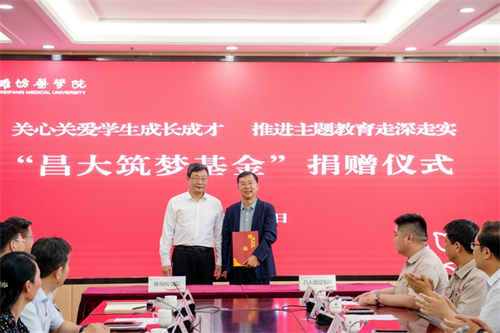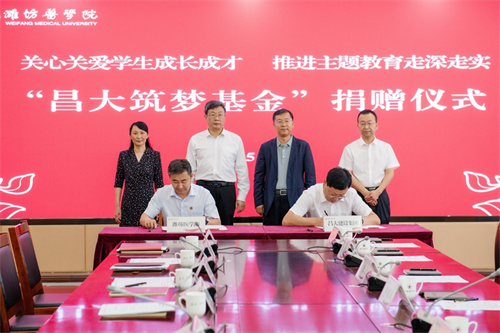 2023年5月18日下午,濰坊昌大建設(shè)集團(tuán)捐贈(zèng)濰坊醫(yī)學(xué)院“昌大筑夢(mèng)基金”捐贈(zèng)儀式在濰坊醫(yī)學(xué)院行政樓隆重舉行。