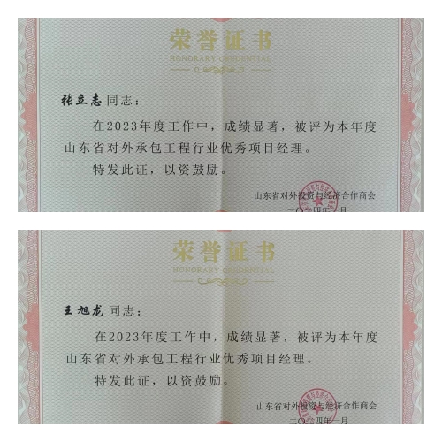 2024年3月12-13日,山東省對外投資與經濟合作商會舉行行業(yè)發(fā)展交流大會,并對2023年度商會先進單位和個人進行表彰,集團獲“二〇二三年度山東省對外承包工程行業(yè)先進單位”榮譽稱號,海外公司張立志、王旭龍獲“山東省對外承包工程行業(yè)優(yōu)秀項目經理”榮譽稱號。