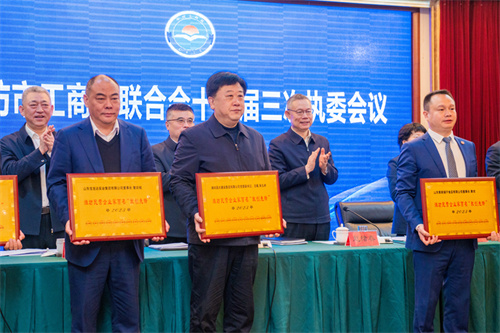 2024年3月22日上午,濰坊市工商聯(lián)十三屆三次執(zhí)委會在金茂國際大酒店召開。集團(tuán)公司總裁朱九洲出席會議并作為濰坊民營企業(yè)家百名“敢創(chuàng)先鋒”代表上臺領(lǐng)獎(jiǎng)。