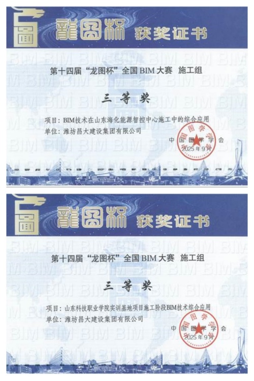 二則是,由中國圖學(xué)學(xué)會舉辦的第十四屆“龍圖杯”全國BIM大賽公布了獲獎結(jié)果。集團(tuán)公司申報(bào)的《BIM技術(shù)在山東海化能源智控中心施工中的綜合應(yīng)用》、《山東科技職業(yè)學(xué)院實(shí)訓(xùn)基地項(xiàng)目施工階段BIM技術(shù)綜合應(yīng)用》均獲三等獎。實(shí)現(xiàn)歷史新突破。